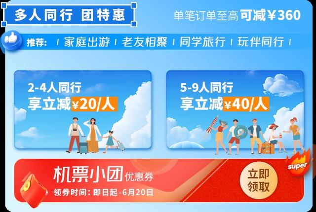 旅游旺季,东航针对多数旅客产生的组团出游需求,推出“机票小团优惠券”,最低2人即可成团使用,成团人数越多,优惠力度越大,单笔订单至高可减 360 元。无论是家庭亲子游、同学聚会游,还是朋友结伴出行,都可助力旅客开启高性价比的夏日旅程。