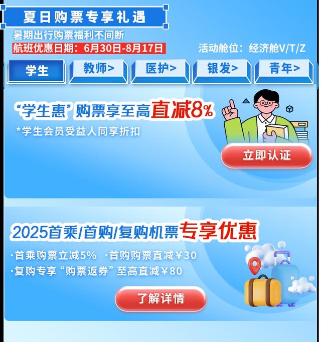 恰逢暑期,毕业旅行、亲子研学出行显著增长,东航推出夏日购票专享礼遇,购票出行更超值。活动期间,完成身份认证的“东方万里行”学生会员可享受至高直减 8% 的专属购票优惠;教师、医护人员、银发群体、青年旅客也可享至高直减 6% 的购票优惠。另外,学生、教师、医护将亲友加入受益人后,购票优惠可同享。