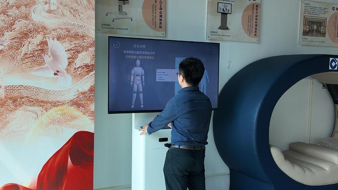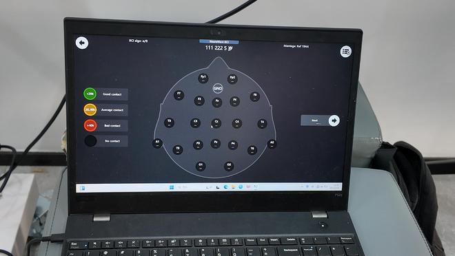 谈话间,戴着“脑电帽”的试验者已进入正常“行走”状态。指着电脑屏幕上的曲线分布图,施柯丞介绍,“脑电帽”的作用是获取患者的脑电信号,同时通过放大器将其捕捉到的脑电信号进行放大,传输至电脑端,然后依靠人工智能算法进行患者运动意图解码,进而控制下肢外骨骼机器人实现拟人化步态运动,帮助患者进行下肢康复训练。