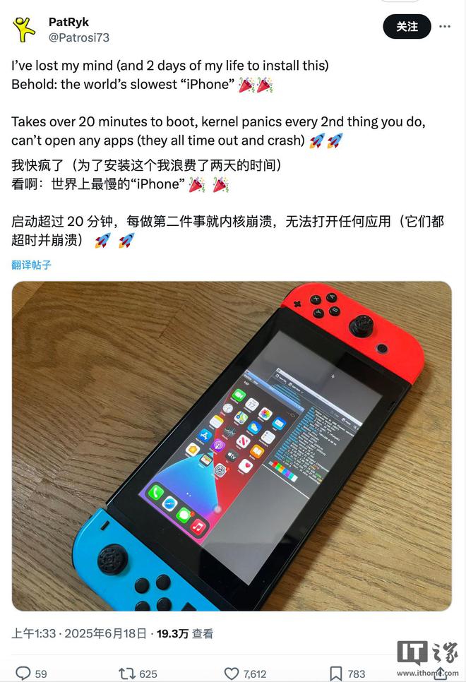 IT之家 6 月 19 日消息,据外媒 9to5Mac 今日报道,X 平台的一名用户 PatRyk 做出了一项大胆举动:花了整整两天时间,尝试在初代任天堂 Switch 上运行 iOS。