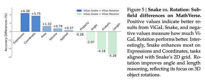 有意思的是,Snake模型在表达式和坐标方面提升最为明显,这些任务与蛇模型的二维网格相关。旋转模型在角度和长度推理方面有所改进,这反映了它对三维物体旋转的关注。