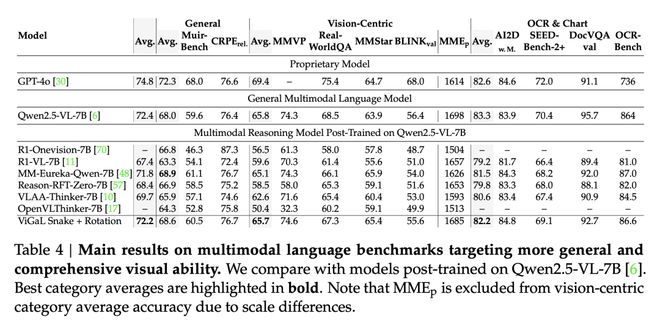 为了全面检验推理任务上的泛化是否会导致通用视觉能力的下降,研究者在更广泛的MLLM基准测试集上评估了ViGaL Snake + Rotation。