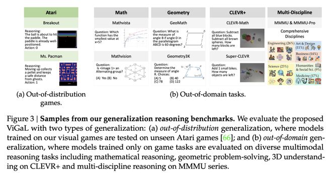 使用两种类型的泛化来评估所提出的ViGaL:(a) 分布外泛化,即在我们的视觉游戏上训练的模型在未见的Atari游戏上进行测试;以及(b) 领域外泛化,即仅在游戏任务上训练的模型在多种多模态推理任务上进行评估,包括数学推理、几何问题解决、CLEVR+上的3D理解以及MMMU系列上的多学科推理