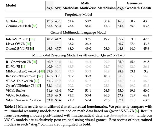 如上表2所示,在Snake游戏上进行后训练在CLEVR+基准测试中取得最佳性能,而在Rotation游戏上训练则在几何推理任务中表现出更强的结果。