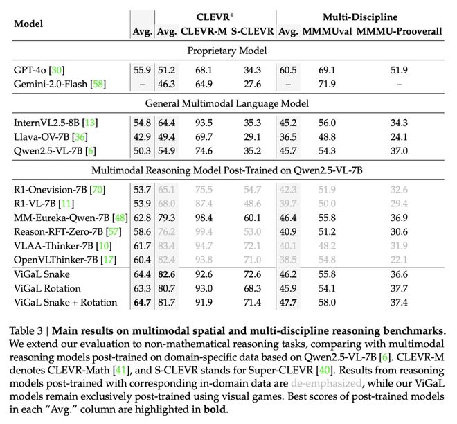 表3显示,ViGaL Snake + Rotation在MMMU系列基准测试中的平均表现比R1-OneVision-7B高出5.4%,这些基准测试评估了多学科推理能力。