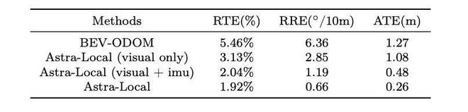 里程计头的主要任务是利用当前和过去的 4D 特征以及额外的传感器数据(如 IMU、车轮数据)来预测机器人的相对位姿。它通过训练一个 Transformer 模型来融合不同传感器的信息,每个传感器模态的数据都经过特定的 tokenizer 处理,再结合模态嵌入和时间位置嵌入,输入到 Transformer 编码器中,最后利用 CLS token 预测相对位姿。在实验中,与基于两帧的基线方法相比,Astra-Local 的里程计头在多传感器融合和位姿估计方面表现出色,如在加入 IMU 数据后,旋转估计精度大幅提升,整体轨迹误差降低到约 2%,进一步加入车轮数据后,尺度稳定性和估计精度进一步增强,展示了其在多传感器数据融合方面的优势。