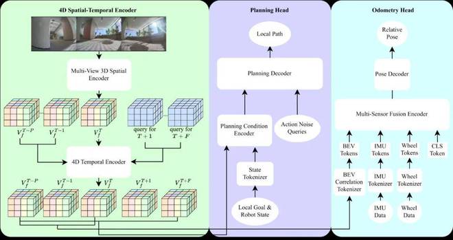 Astra-Local 则是 Astra 架构中负责高频任务的智能助手,它是一个多任务网络,能够从传感器数据中高效地生成局部路径并准确估计里程计。其架构包含三个核心组件:4D 时空编码器、规划头和里程计头,每个组件都发挥着不可或缺的作用。
