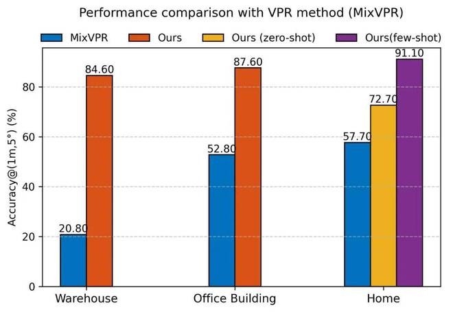 Astra-Global 的多模态定位能力通过一系列实验得到了验证。在处理文本和图像定位查询时,Astra-Global 表现出色。对于目标定位任务,它能够准确地根据文本指令在地图中识别出匹配的图像和位姿,例如当接收到 “找到休息的地方” 这样的指令时,Astra-Global 能够迅速定位到地图中沙发等休息区域的位置信息。与传统的视觉位置识别(VPR)方法相比,Astra-Global 具有较大优势。在细节捕捉方面,传统 VPR 方法常依赖全局特征,容易忽略像房间号这样的精细细节,而 Astra-Global 能够精准捕捉这些关键信息,避免在相似场景中出现定位错误。在视点变化的鲁棒性上,Astra-Global 基于语义地标进行定位,即使相机角度发生较大变化,地标之间的相对位置关系保持不变,使其能够更稳定地进行定位,而传统 VPR 方法在面对大的视点变化时往往会出现定位偏差。在位姿精度上,当存在多个相似候选位置时,Astra-Global 能够利用地标空间关系选择最佳匹配位姿,在 1 米距离误差和 5 度角误差范围内的位姿精度显著高于传统 VPR 方法,在仓库环境中的位姿精度比传统方法提升了近 30%+。