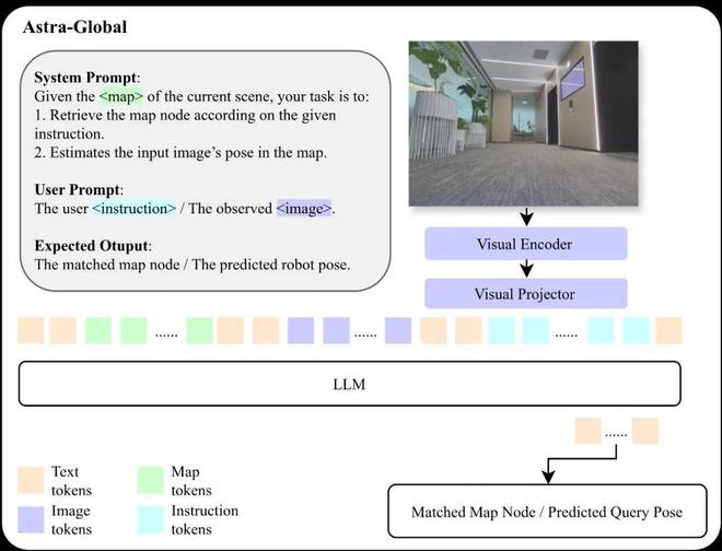 Astra-Global 作为 Astra 架构中的重要组成部分,犹如智慧大脑,承担着关键的低频任务,即自我定位和目标定位。它是一个多模态大语言模型(MLLM),能够巧妙地处理视觉和语言输入,在全局地图中实现精准定位。其核心在于利用混合拓扑语义图,将其作为上下文输入,使得模型能够依据查询图像或文本提示,在地图中准确找到对应的位置。