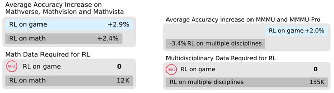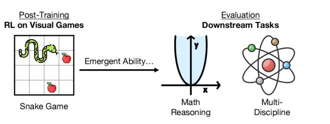 图 1: 我们发现,只在例如贪吃蛇这种游戏上进行强化学习训练,模型就能涌现出领域外的泛化能力,在数学、多学科等多个任务上提高性能。