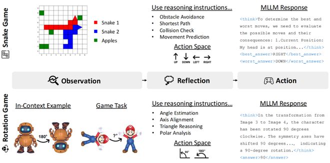 图 3: 我们在贪吃蛇游戏和旋转游戏上利用强化学习进行训练。在每个游戏里面,模型会接收图片和文本形式的游戏环境作为输入,遵循游戏指令进行推理,抉择一个动作在游戏环境里执行。执行后会从环境获得奖励,用于进行强化学习。通过在游戏中训练,模型获得了推理能力,并且能迁移至下游的数学和多学科等任务。