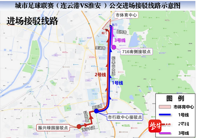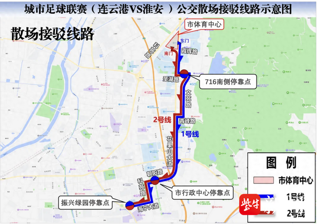 在市体育中心东门、南门设置2条散场接驳线路,并在716研究所南侧停车场、市政府南广场、振兴绿园设置3个停靠点,接驳时间为比赛结束至散场结束。