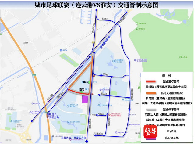 6月28日19点整,连云港市体育中心将迎来“苏超”第五轮比赛——连云港队与淮安队之战。前往现场的观众朋友,一定要关注赛场周边的交通情况。为保障体育中心周边道路交通安全、顺畅、有序,公安机关交警部门将推出以下服务举措: