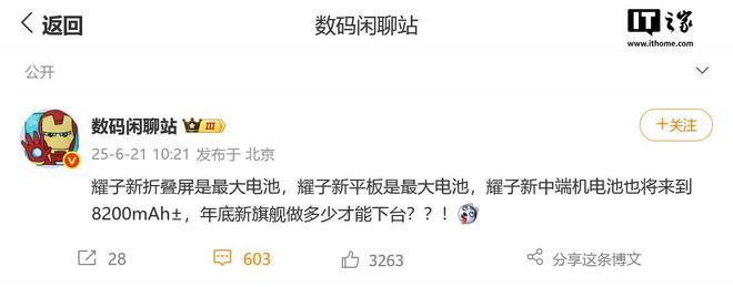 根据消息源 @数码闲聊站 于 6 月 21 日发布的微博,内容写道:“耀子新折叠屏是最大电池,耀子新平板是最大电池,耀子新中端机电池也将来到 8200mAh±,年底新旗舰做多少才能下台??!”