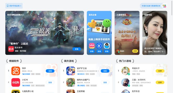 打开应用宝PC端,映入眼帘的发现页面重心明显,自家泛娱乐生态的产品如起点小说、《金铲铲之战》与小游戏占领“货架”,余下的外部应用与内容则是PC端体验不佳的快手、小红书等原生移动应用与保持高增长的短剧。