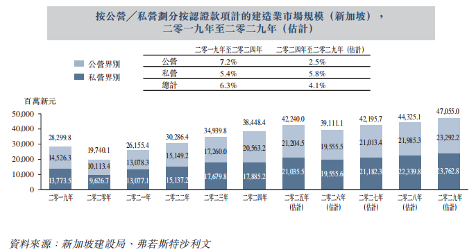 根据新加坡统计局和弗若斯特沙利文,新加坡建造业核证进度付款的总价值乃指全部已竣工工程及核证进度付款的总价值。该等数字自二零一九年至二零二四年呈显著增长,并预计将持续稳步增长至二零二九年。在持续的公营界别建筑需求(包括地铁线、公共房屋开发及医疗设施等基础设施项目)带动下,同时建筑工程因COVID-19疫情中断后逐步复苏,认证进度付款总额由二零一九年的28,299.8百万新元增加至二零二四年的38,448.4百万新元,期间的复合年增长率约为6.3%。