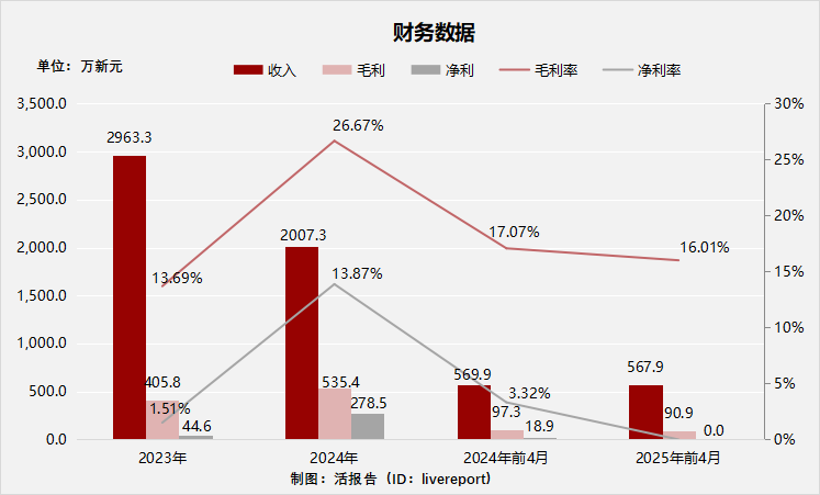 收入分别约为新元2963.3万元、2007.3万元、569.9万元及567.9万元,2024年同比增长率为-32.26%,2025年前4月同比增长率为-0.35%;