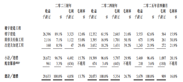 于往绩记录期,公司的收益绝大部分来自楼宇建造工程,其余部分主要来自建造业的劳工供应、宿舍租金收入及其他配套服务所产生的收益。
