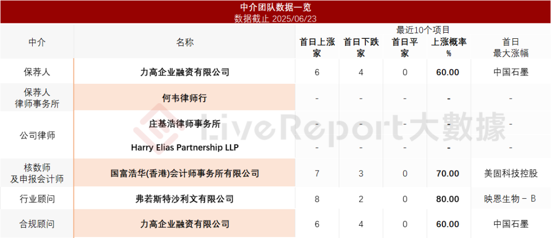 据LiveReport大数据统计,长乐控股中介团队共计7家,其中保荐人1家,近10家保荐项目数据表现平平无奇;公司律师共计2家,新起之秀无过去数据参考。整体而言中介团队历史数据表现可参考性不高。