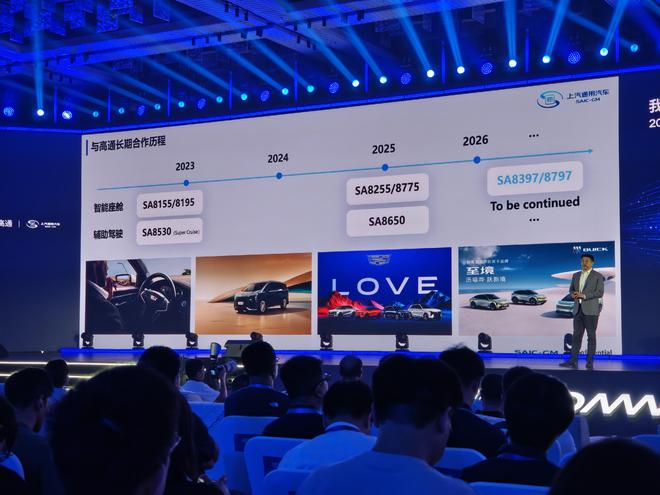同样上场为高通站台的,还有上汽通用的副总经理王晨东,他表示通用接下来将围绕高通来打造自己的座舱和辅助驾驶体系,2025年接下来有两款重磅车型围绕SA8775打造,2026年升级到SA8397和SA8797。