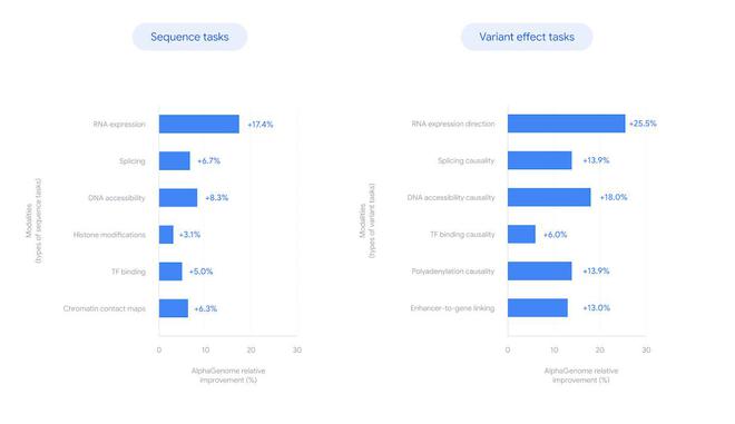 AlphaGenome在广泛的基因组预测基准中实现了最先进的性能,例如预测DNA分子的哪些部分将会靠近,遗传变异是否会增加或减少基因的表达,或者它是否会改变基因的剪接模式。