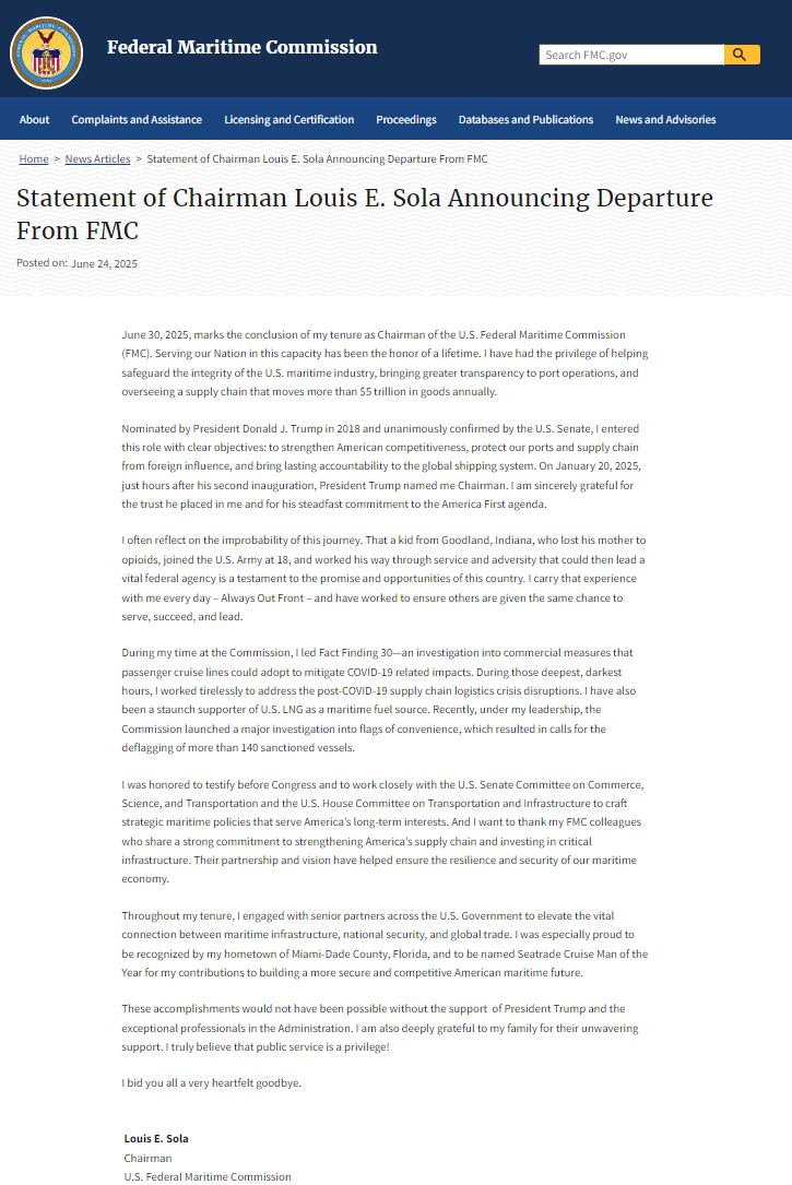航运界网消息,当地时间6月24日,在特朗普任命Louis E.Sola为美国联邦海事委员会(FMC)主席不到6个月后,他宣布辞职。