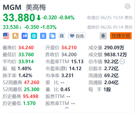格隆汇6月26日|美高梅(MGM.US)盘前跌1.03%,报33.53美元。消息面上,多家机构此前下调美高梅目标价,其中,杰富瑞将其目标价从53美元调整为50美元;麦格理将其目标价从50美元调整为48美元;瑞穗证券将其目标价从60美元调整至59美元;巴克莱银行维持其“买入”评级,目标价从47美元下调至41美元。此外,摩根大通近日给予美高梅“持有”评级,目标价为38美元。(格隆汇)