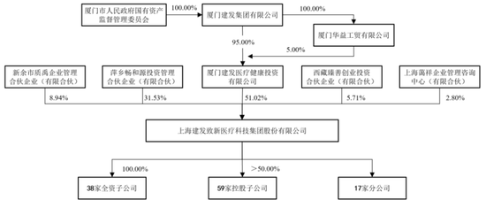建发医疗持有发行人股份的比例为51.02%,系发行人的控股股东。建发集团和厦门华益工贸有限公司分别持有建发医疗95.00%和5.00%的股权,建发集团持有厦门华益工贸有限公司100.00%股权,因此,建发集团直接及间接持有建发医疗100.00%股权;厦门市国资委持有建发集团100.00%股权,间接持有建发医疗100.00%股权,从而间接持有发行人51.02%股份。因此,厦门市国资委为发行人实际控制人。