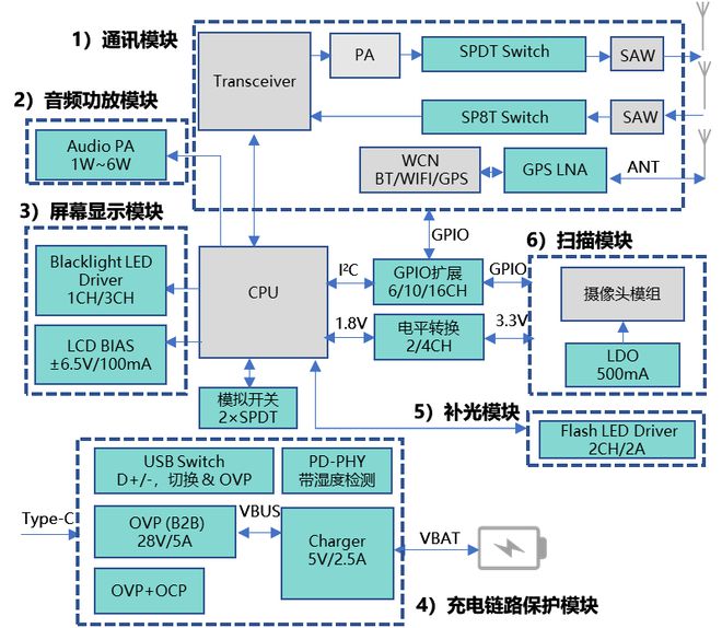 艾为凭借17年在模拟芯片领域的深耕经验,针对移动数据终端等行业应用的特性与需求,开发出一系列产品,并量身定制应用解决方案。以下是对艾为移动数据终端应用系统框图的详细说明: