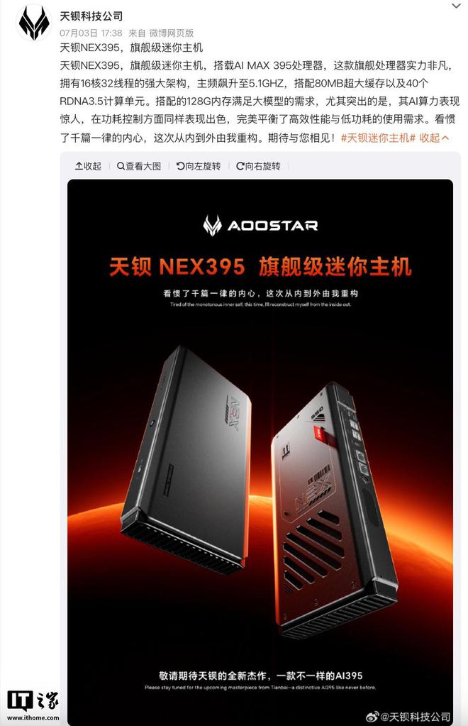 IT之家 7 月 4 日消息,天钡官方微博现已预热一款型号为“NEX395”的迷你主机,该机主打 AMD 锐龙 AIMAX+395 处理器(海报字样为“AI MAX 395”,预计实际指代“AIMAX+395”),将于近期发布。