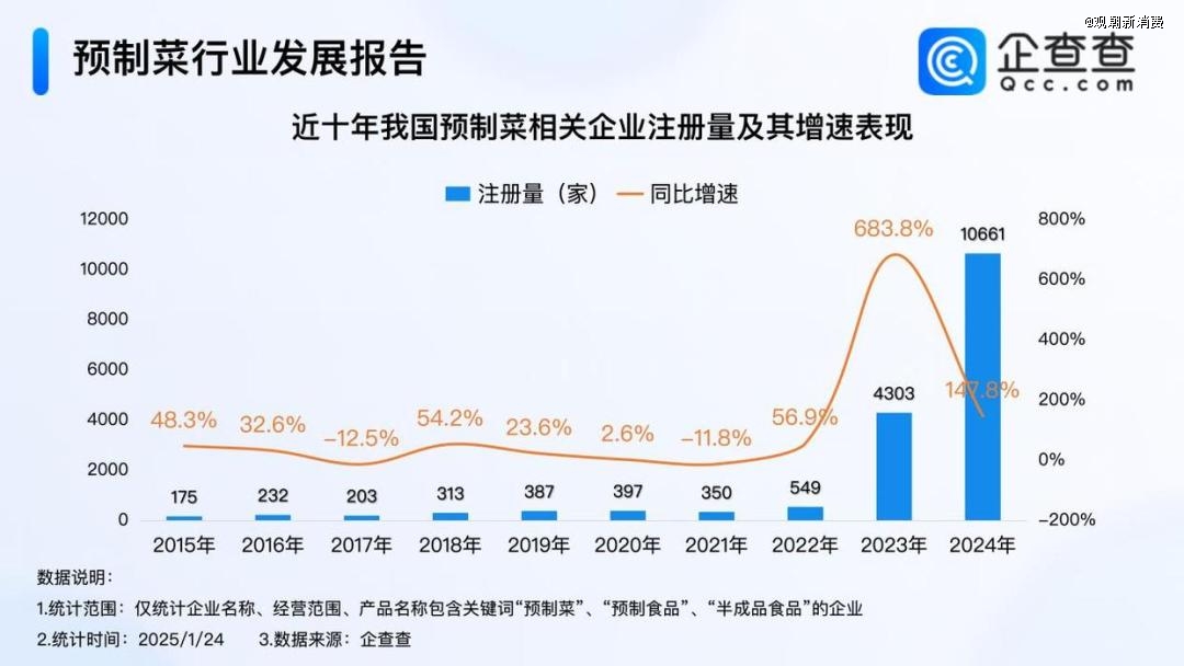 企查查数据显示,2023年,预制菜首次写入中央一号文件,预制菜相关企业全年注册量激增至4303家,达近十年预制菜相关企业注册量增速峰值;2024年我国预制菜相关企业注册量首次破万家,全年注册量同比增加147.8%至10661家,创近十年注册量新高。