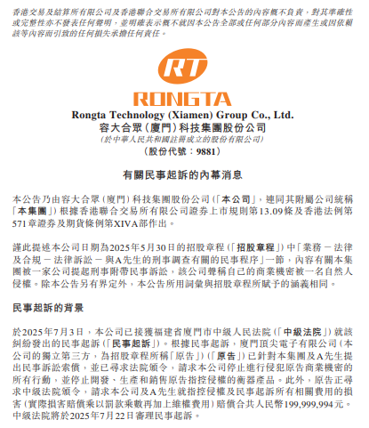 齐鲁晚报·齐鲁壹点记者了解到,7月3日晚间,容大科技(09881)公告称,公司已接获福建省厦门市中级人民法院发出的民事起诉。