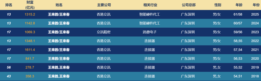 如今,对于立讯精密以及王来春而言,都到了一个重要的关口,若能顺利在港股实现IPO,立讯精密大概率将再上一个台阶,届时立讯精密掌舵人的财富也大概率再上一个台阶。据2025新财富500创富榜,王来胜/王来春兄妹以1315.2亿元财富位列13。