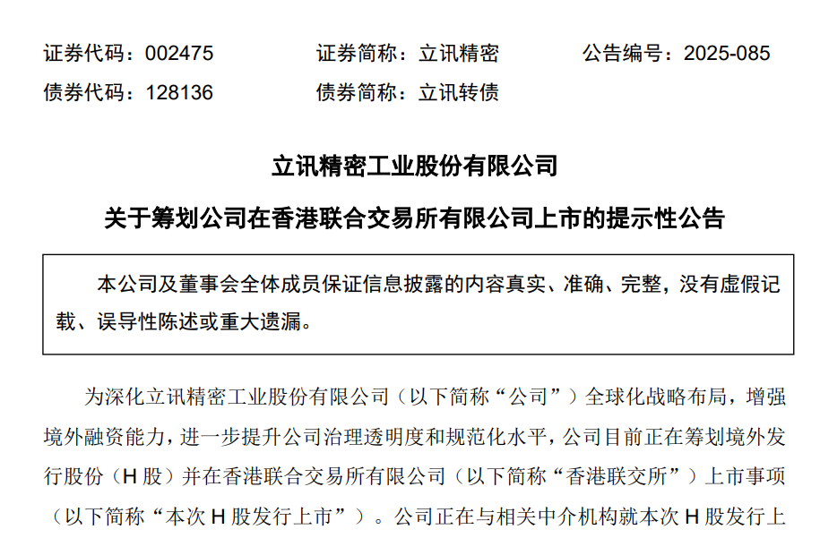 7月2日晚间,立讯精密公告,公司正在筹划境外发行股份(H股)并在港交所上市事项。