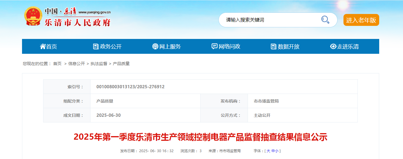 2025年1月,根据《中华人民共和国产品质量法》、《浙江省产品质量监督条例》的规定,乐清市市场监督管理局组织开展了全市控制电器产品监督抽查,抽查了30家企业的30批次控制电器产品,不合格1批次,批次不合格率为3.33%。