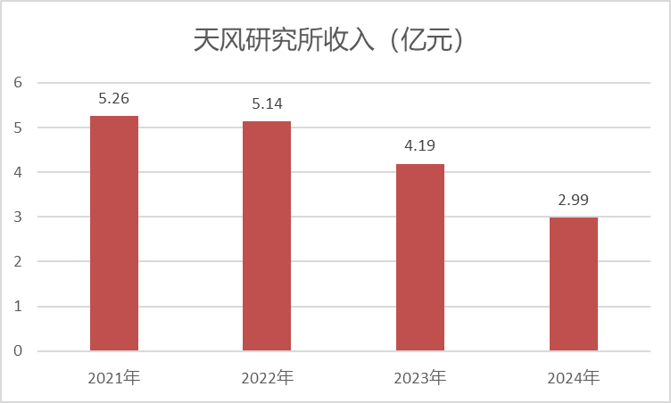 其实,相较于公司整体业绩,天风研究所收入还算稳定,22年收入依旧在5亿上方,23年下滑18.43%至4.19亿,24年执行万五之后,天风研究所收入再度下滑近30%至2.99亿。