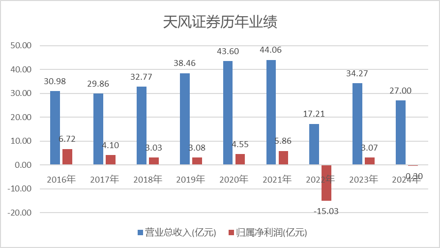 金石杂谈查询发现,天风证券近些年业绩确实下滑严重,尤其2022年以来公司业绩滑铁卢,21年营收44亿,利润5.86亿,但到了22年收入只有17.21亿,利润直接转为巨亏15亿,在23年有所反弹后,24年营收再度下滑21%至27亿,利润再度转为亏损0.3亿。