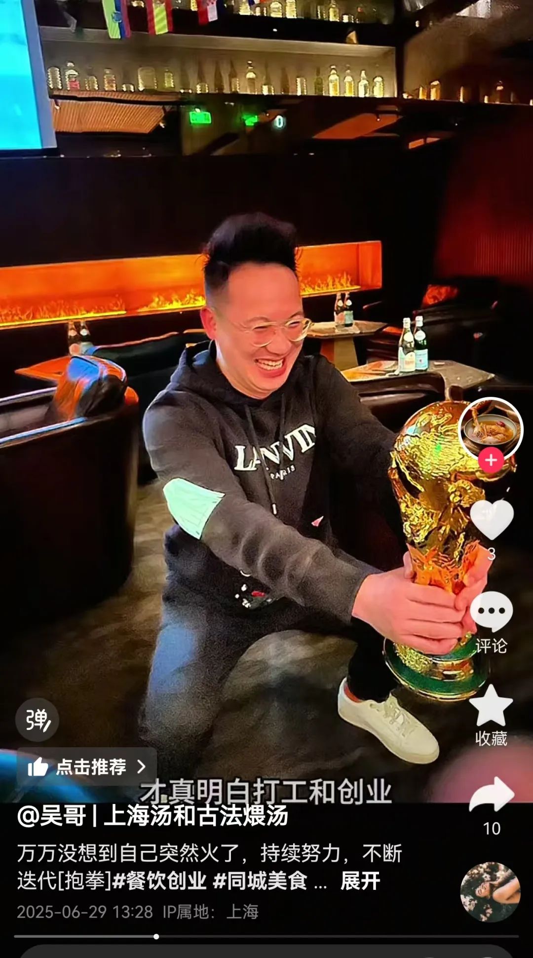 在第一个视频中,标题就是万万没想到,自己突然火了。他表示,以前在券商研究的是服装赛道,路演、PPT做的飞起,年薪百万不是梦;结果现在,天天研究的是哪个食材好,哪个更好卖,这锅老火汤要煨足几个钟。从首席分析师到首席煨汤师这跨度,自己都服了。