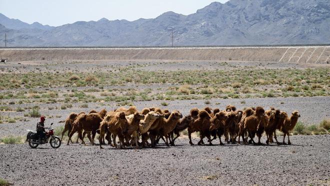 ▲牧民正用摩托将骆驼赶回牧场。何惠子|摄在拼多多的支持下,孟根的一次次实惠网购实现了。随着她对新水泵的一通操作,水管的水向外涌出。她先清洗了骆驼的水槽,洁白的水花涌向水槽时,清凉的生命力也向干旱的戈壁涌来。