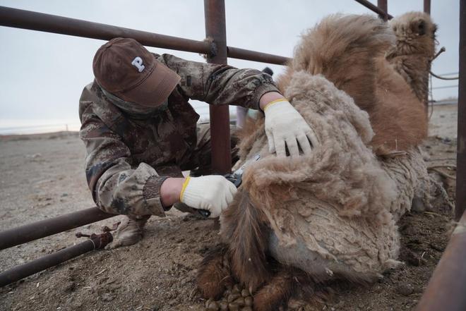 一峰峰骆驼走进孟根为它们设置的护栏里。在那里,它们排队站着望向前方,任人用长剪刀顺着它们皮毛的肌理“咔嚓咔嚓”。浅棕色的骆驼伏在孟根身前,头扭到后面。孟根单膝蹲下,黑白色的运动卫衣下,一副紫手套麻利地挥舞着剪刀。