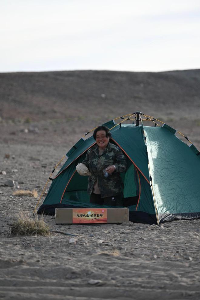 更花时间的是日复一日地在此坚守。十九年前初来戈壁,朝乐蒙花一身黄裙、踩一双高跟鞋。如今,快六十岁的她坐在小帐篷里守着羊群,一口一口吃着用小锅做的麻婆豆腐,时光爬上了她被风吹日晒的脸。