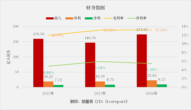 收入分别约为人民币159.50亿、146.76亿、173.93亿,2024年同比增长率为18.51%净利分别约为人民币19.12亿、19.39亿、23.02亿,2024年同比增长率为18.72%净利分别约为人民币7.72亿、8.71亿、9.57亿,2024年同比增长率为9.82%毛利率分别约为11.99%13.21%13.24%净利率分别约为4.84%5.94%5.50%