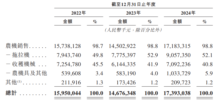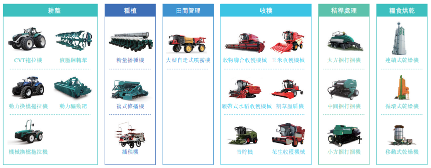 公司拥有全面的产品组合,涵盖高质量的智能农机,主要包括(i)拖拉机;(ii)收获机械;(iii)农机具。以革新现代农业为目标,我们的成套智能农机可覆盖耕整、种植、田间管理、收获、秸秆处理与粮食烘干等现代农业生产的各个环节。