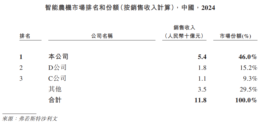 弗若斯特沙利文的资料,2024中国智能农机销售收入约为118.4亿元复合年均增长率77.9%;预计中国智能农机市场规模在2030年达到约1,039.0亿元,2024年到2030年期间,复合年均增长率约43.6%