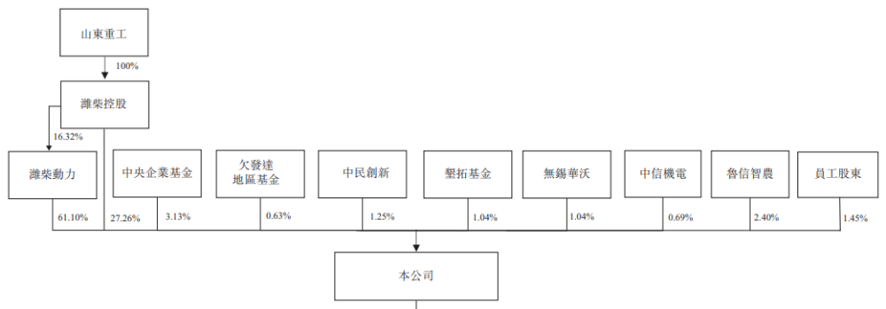 山东重工旗下潍柴动力(2338.HK/000338.SZ)、潍柴控股分别持股约61.10%、27.26%;国投创益产业基金管理的中央企业基金、欠发达地区基金分别持股约3.13%、0.63%;鲁信智农持股约2.40%;中民创新持股约1.25%;垦拓基金持股约1.04%;无锡华沃持股约1.04%;中信机电持股约0.69%;员工股东持股约1.45%。