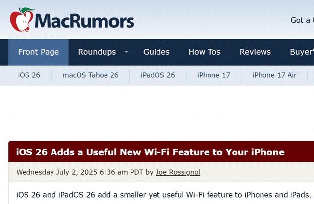 【环球网科技综合报道】7月3日消息,据外媒macrumors报道,最新发布的 iOS 26 为 iPhone 用户带来了一项Wi-Fi 功能升级,这一改进有望极大地优化用户在多设备场景下的网络连接体验。