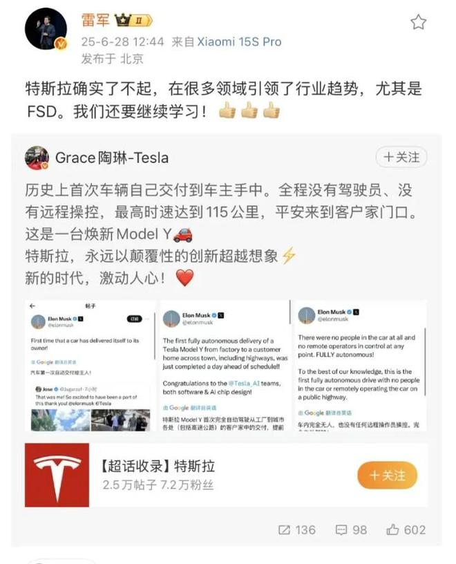 特斯拉副总裁陶琳发微博称,“历史上首次车辆自己交付到车主手中。全程没有驾驶员、没有远程操控,最高时速达到115公里,平安来到客户家门口。这是一台焕新Model Y。”小米集团董事长雷军随后转发其博文称,“特斯拉确实了不起,在很多领域引领了行业趋势,尤其是FSD。我们还要继续学习。”