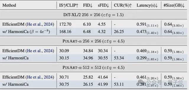 该工作还验证了HarmoniCa与模型量化技术的高度兼容性。在 PIXART-α 256×256 场景下,将HarmoniCa应用于4bit量化模型(EfficientDM),推理速度从1.18×提升至1.85×,FID仅略增0.12,几乎无感知差异。说明HarmoniCa不仅可独立提速,也能作为“加速插件”叠加于量化模型之上,进一步释放性能潜力。未来,该工作也计划探索其与剪枝、蒸馏等技术的组合能力,为DiT模型的轻量部署开辟更多可能。
