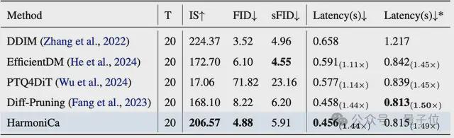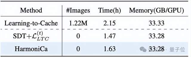HarmoniCa 采用无需图像的训练策略,仅基于模型和噪声即可完成优化,不依赖任何额外数据。在同等训练轮次下,其训练时间比主流方案 LTC 缩短约 25%,显存占用相近,可在单卡稳定运行,适合闭源模型加速和快速迭代。