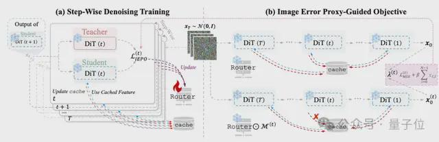 2)教师-学生结构:学生使用缓存进行去噪,教师不使用缓存作为“理想输出”;3)每一时间步的Router都被独立更新,显式对齐多轮缓存路径下的输出误差;4)学生模型每步将自己的输出作为下一个输入,使得误差传播机制贴近真实推理轨迹。